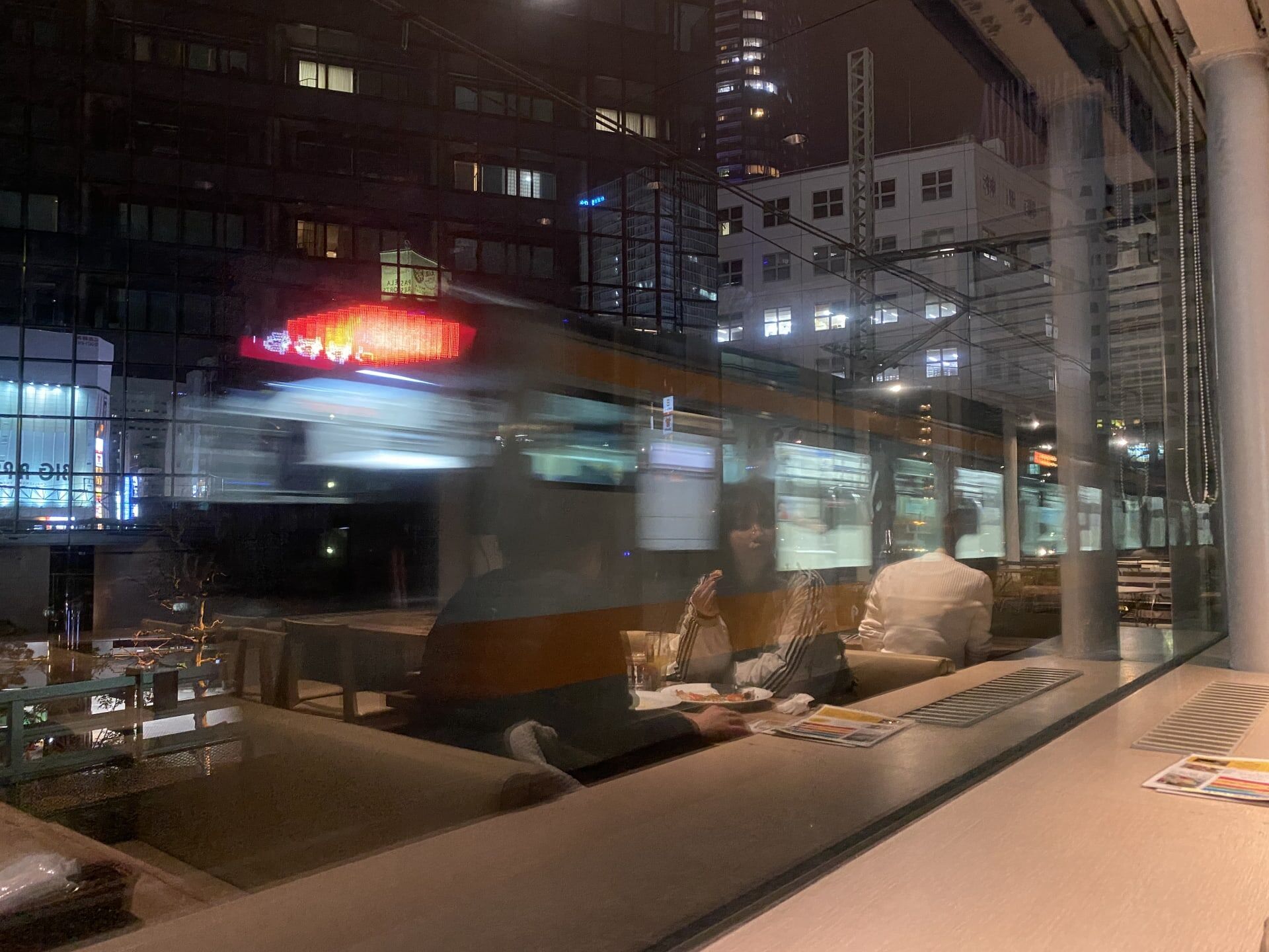 Just a short walk from Akihabara Station, I found the Platinum Fish Café, which is uniquely located on the old platform of the former Manseibashi Station. Once a stop on the Chūō Main Line between Kanda and Ochanomizu Stations, Manseibashi Station closed in 1943, but its platform has since been reimagined as a café with large floor-to-ceiling windows. This provides a unique train-viewing experience as guests can enjoy a meal or drink while watching trains speed past on both sides of the track. Capturing a clear shot of the trains was tricky, but the images below provide some indication of the experience.