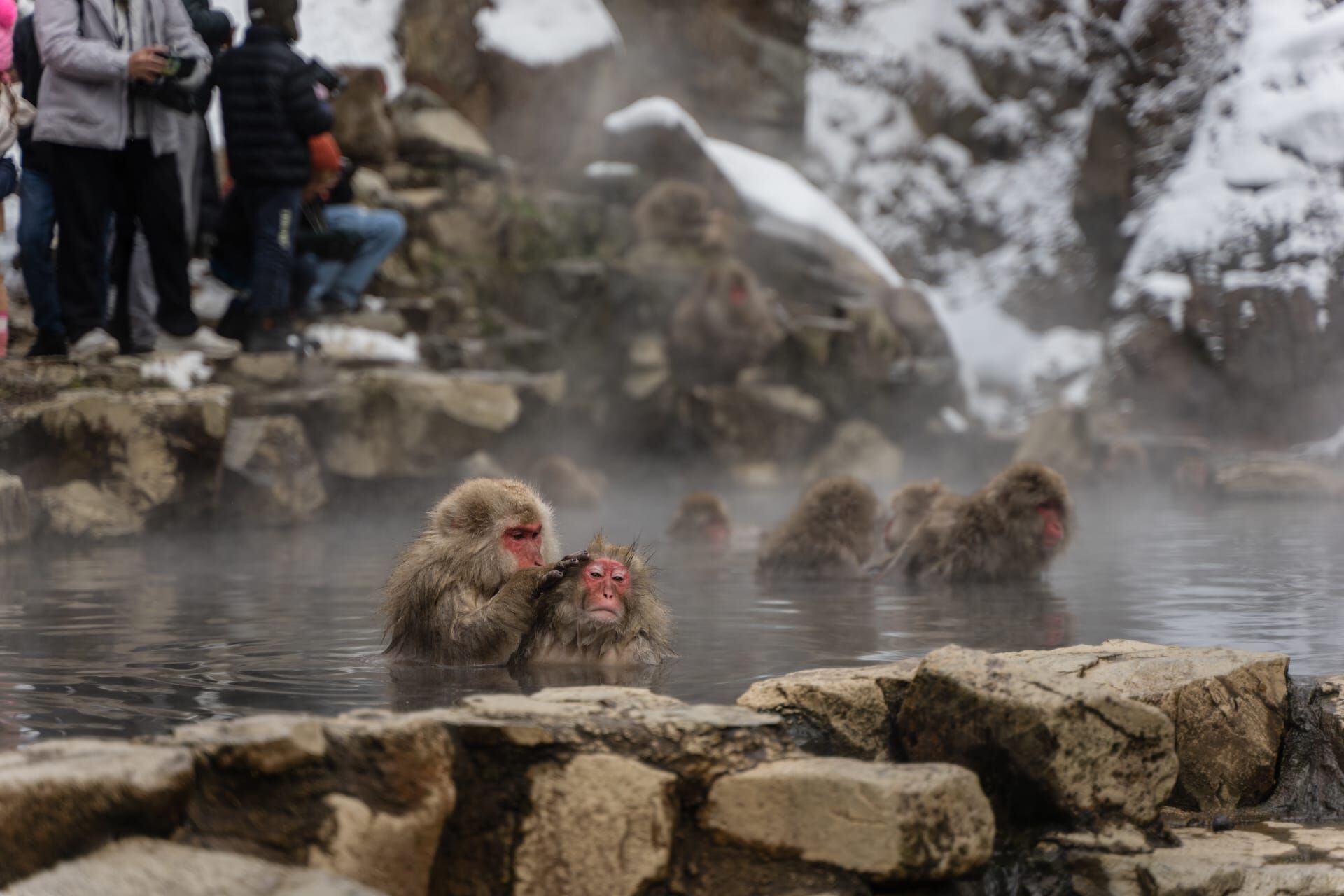 The snow monkeys are native to Japan and are the only monkeys in the world that bathe in hot springs. Legend has it that this tradition began when an apple was tossed into the steaming waters, and a curious young monkey leapt in to retrieve it. The monkey discovered the bliss of soaking in the warm waters and before long, other monkeys had followed suit.7 We enjoyed watching the monkeys relaxing in the water, grooming one other, and balancing their way across tightropes.