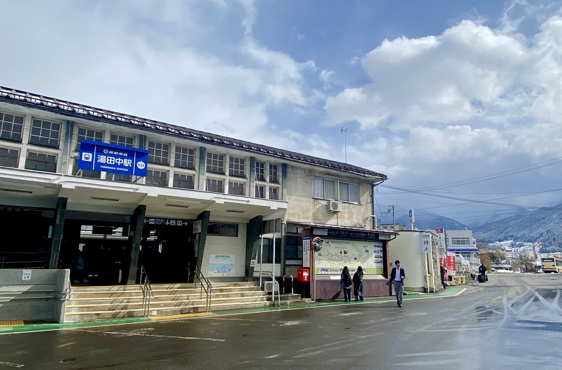 From Nagano Station, we travelled on the Nagano Electric Railway (Yukemuri Express) to Yudanaka Station—a journey of approximately 45 minutes. This train has a distinctive front carriage, with the driver climbing into the ceiling and operating the train from above the passengers.