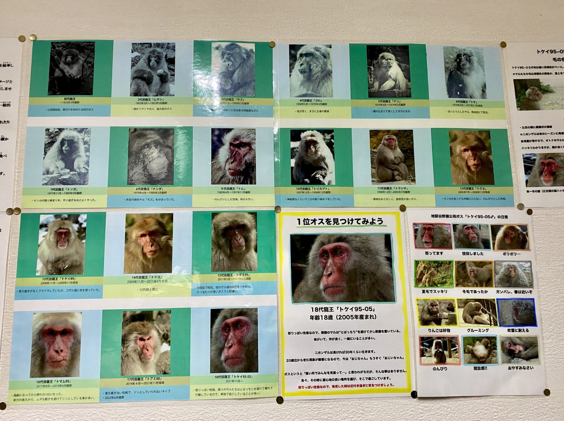 The visitor centre at Jigokudani Monkey Park contains a poster which has information about each of the monkeys, including their name, age, and main personality traits.