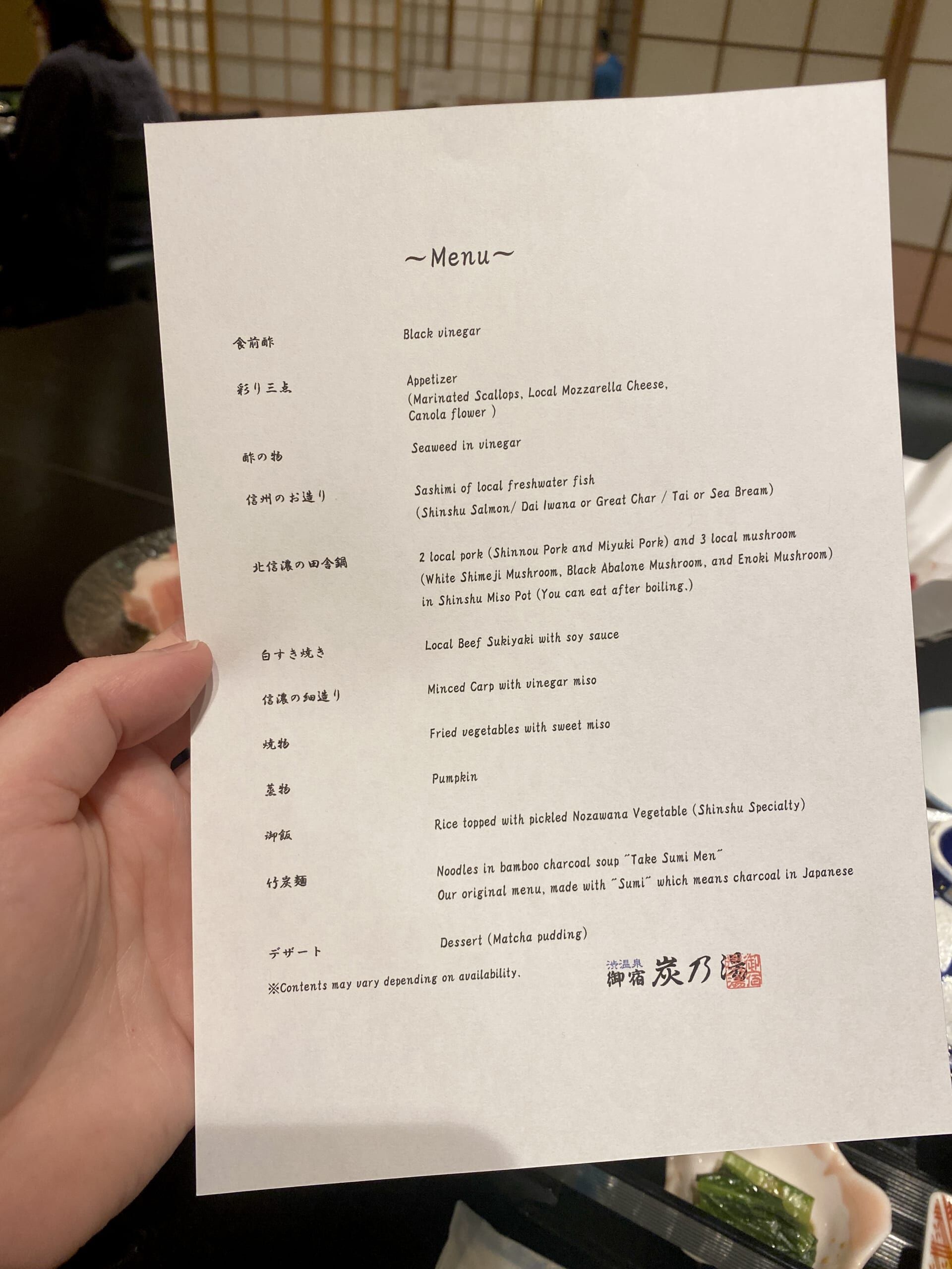 After our time at Jigokudani Monkey Park, we returned to Shibu Onsen and checked into our accomodation at Suminoyu Ryokan. Our stay included breakfast and dinner, as well as onsen access. In addition to the nine public bath houses in Shibu Onsen, our ryokan also had five of its own baths.